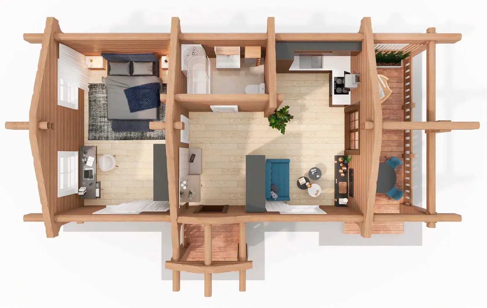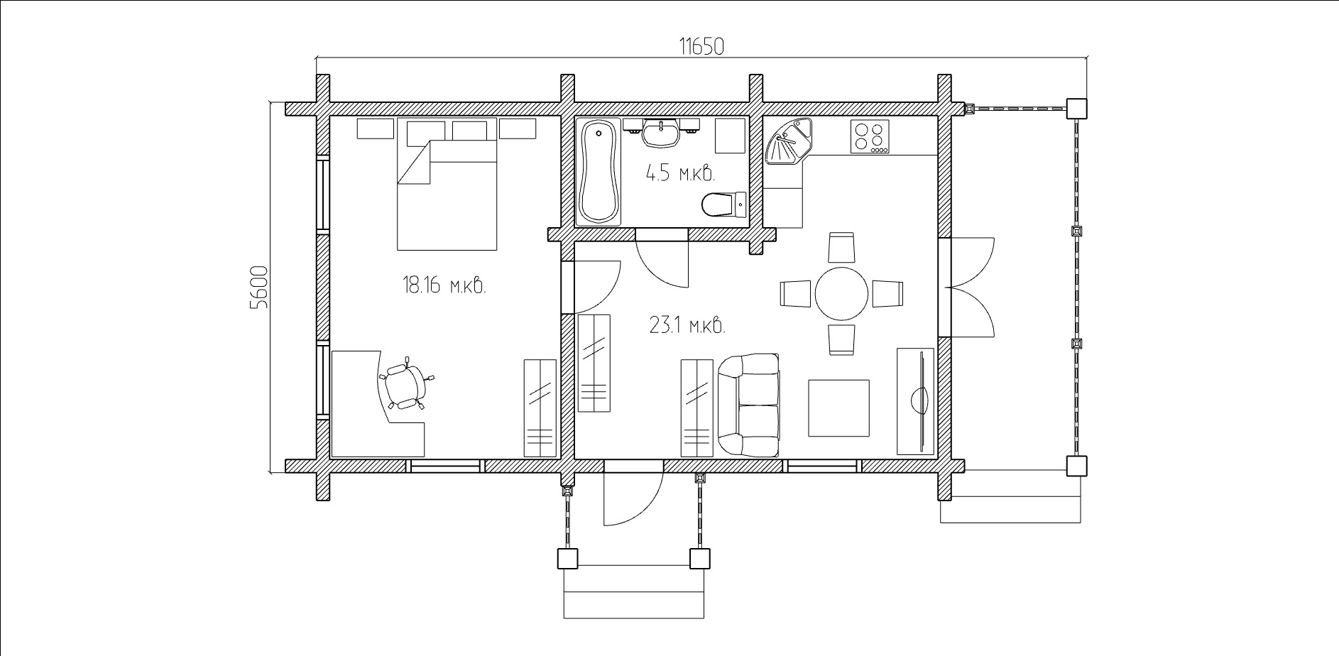 Мечта миллионов людей о комфортном уединённом домике в деревне, нашла отражение в проекте сруба загородного бревенчатого дома из лафета СС45. Комфортабельная комната в 18 квадратных метров найдётся не в каждой городской квартире. В комнате может быть расположено всё необходимое для жизни, комфортного отдыха и время препровождения. Зал совмещённый с кухней и прямой выход из зала на террасу, дарят ощущения свободы и безграничного пространства. А терраса становится дополнительной жилой площадью и позволит пить горячий чай из самовара наслаждаясь свежим воздухом. Дом — истинная мечта двух из трёх городских жителей уставших от копоти и смога шумного города и желающих уединения. Так же сохранится возможность встретиться с друзьями, посидеть в просторном зале за большим столом и конечно обустроить место в зале для ночлега засидевшихся гостей. Комфорт и уединение — это главное достоинство небольшого сруба дома из лафета выполненного по проекту СС45